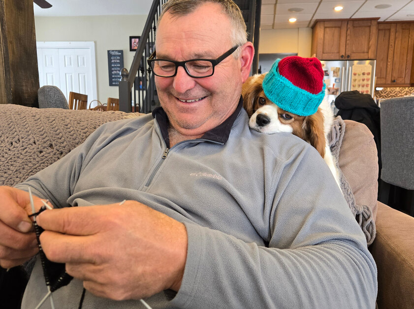 His trusty dog Diesel jumps on his lap. Diesel is a purebred Cavalier King Charles Spaniel, which they bought from Larry’s right-hand man, Luke Clarke, who breeds them as a side hustle. Diesel doesn’t like the four-needle method – he often gets poked – but by using four needles, Larry makes a hat with no seams, perfect for delicate baby heads, especially with premature deliveries. It takes him about two evenings to make one hat.